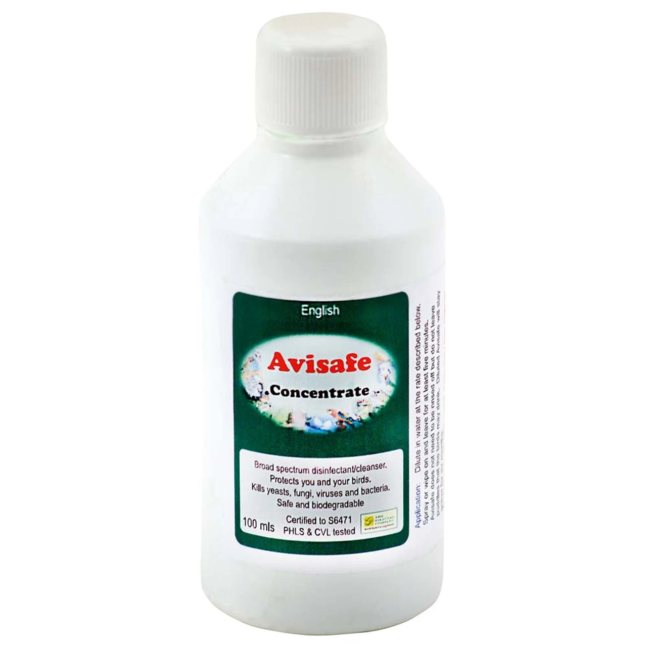 1 part Avisafe to 100 parts water for cages, food and water containers, incubators, brooders and perches. 1:100 – 5 mls Avisafe (1 teaspoon) to 500 mls (1 pint) water.