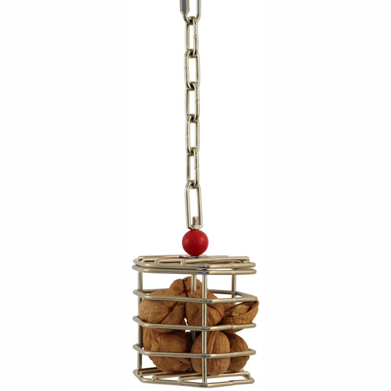 The skewer part inside can be used to hold materials or foods more securely, making them more difficult to access. The stainless steel cage design means no paint that will chip and flake, or metal that may rust. It promotes your Parrot to attempt retrieving their prize from all angles including from the top and bottom; a great way to keep them active.
