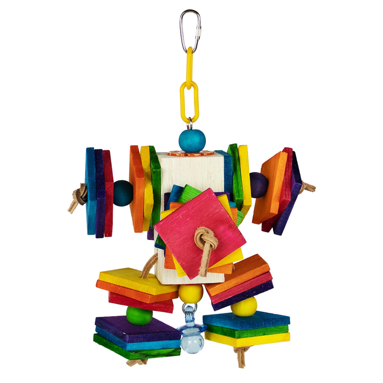 Fastened to a chunky natural balsa soft wood block, are many colourful balsa soft wood slats, and harder wood beads. Thy are all perfect for chewing on, helping to keep your Parrot’s ever-growing beak healthy and trim.