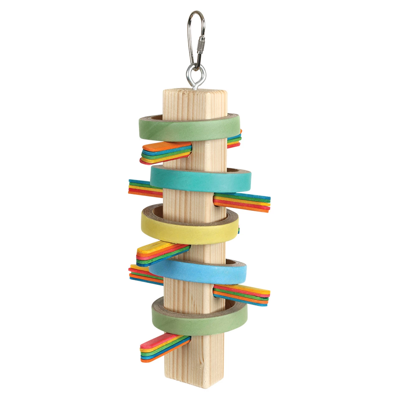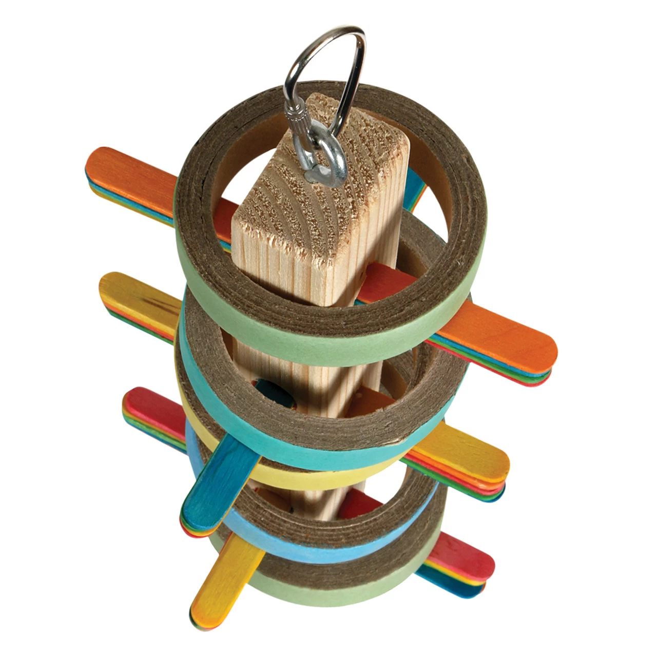 Plus, for puzzle loving Parrots, they can enjoy spending time attempting to remove the coloured wood lolly sticks (which have been wedged through the block), and the cardboard birdie bangles that are looped around a wood block.