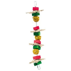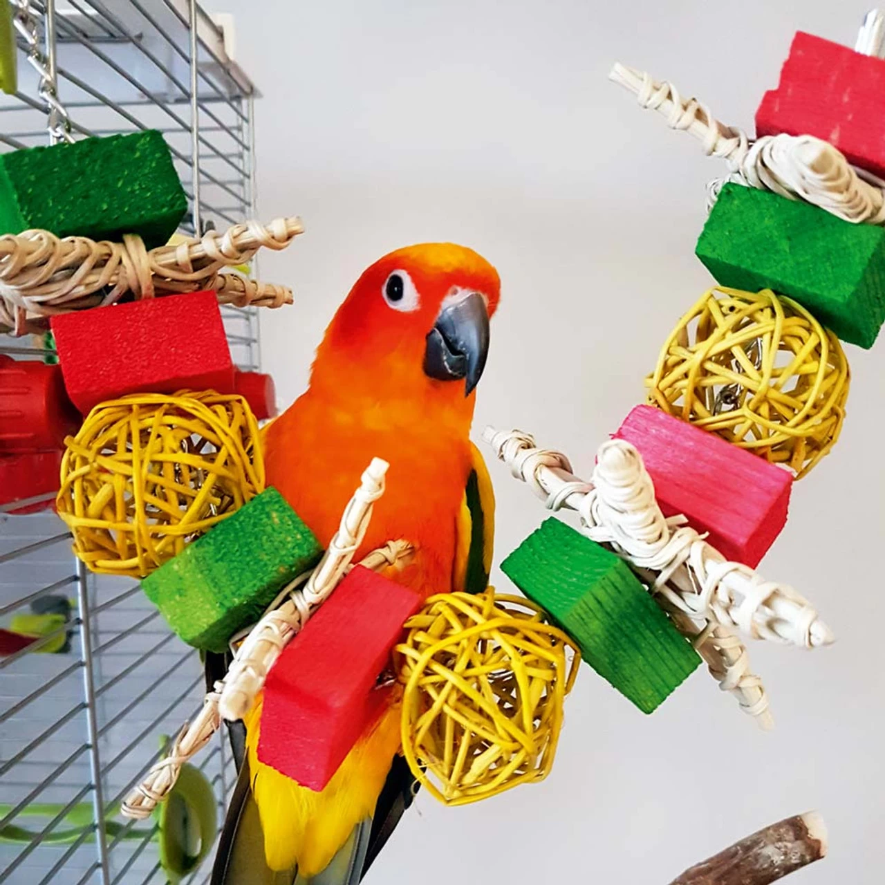 Festively coloured wood slats, wood beads, woven vine balls and some natural woven vine stars provide lots for your feathered friend to enjoy chewing on and unravelling.