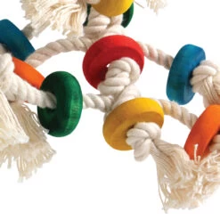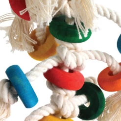 Chewing on the coloured wood discs helps your Parrot keep their beak healthy and trim. Your Parrot can use the soft white knotted cotton rope for preening on. Providing materials your bird can preen on helps to reduce unwanted overpreening behaviours; keep them looking fantastic.