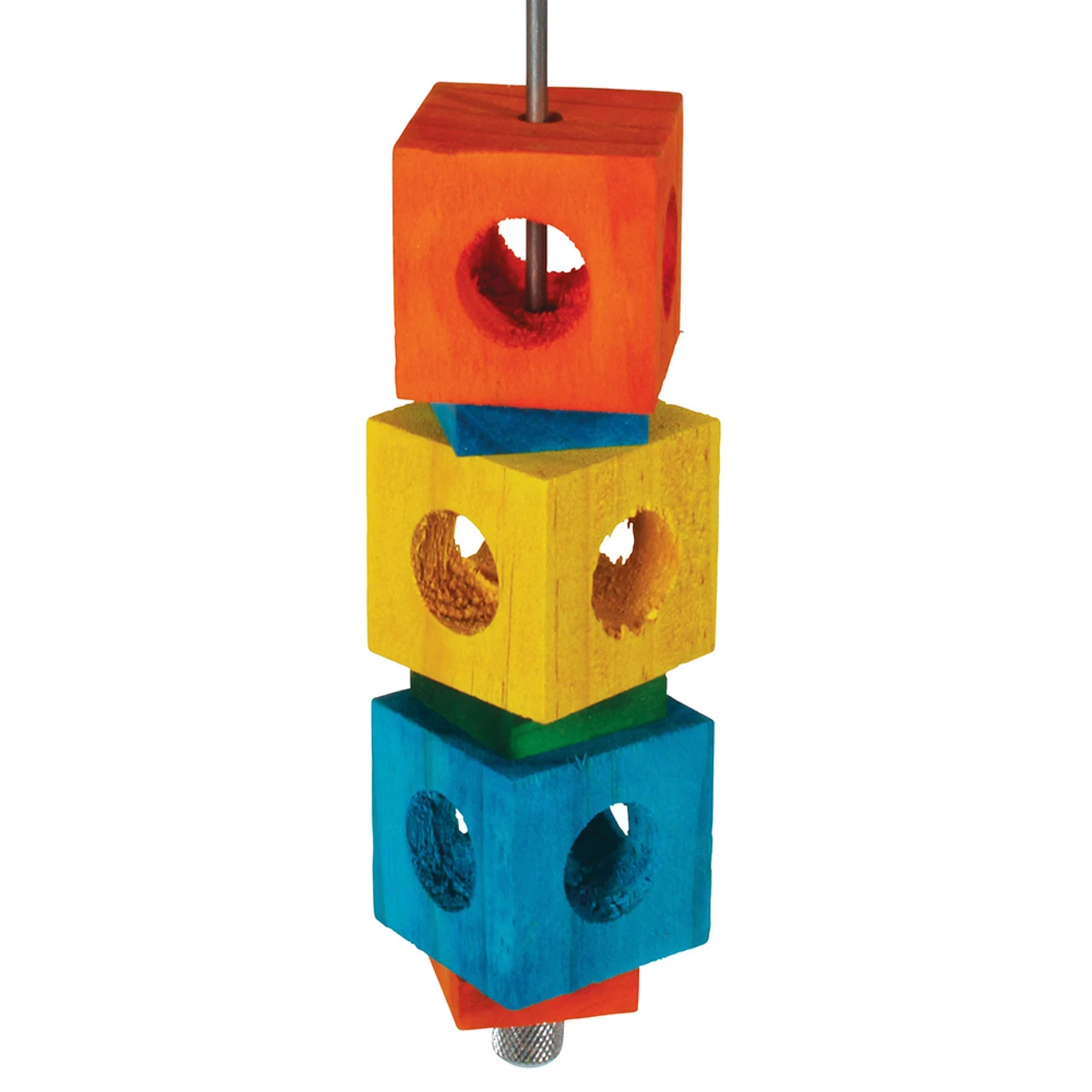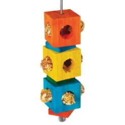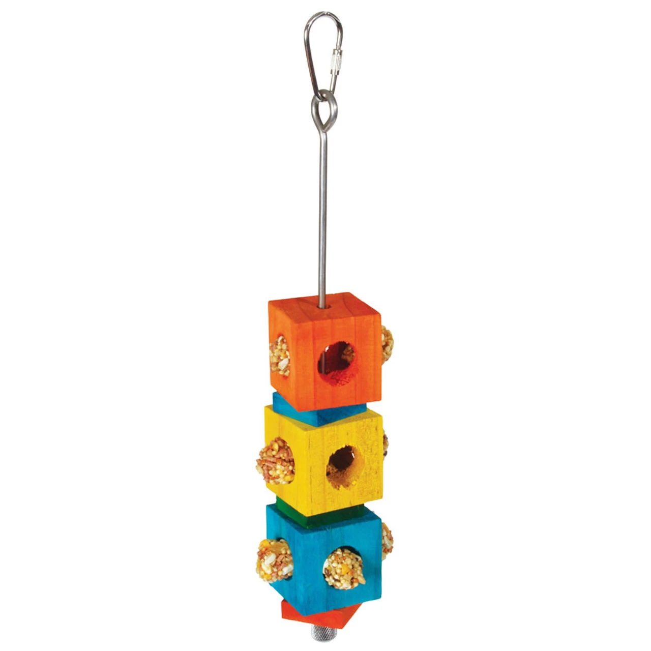 Fastened to the metal skewer are colourful wood shapes. The cubes have been drilled through from each side providing spaces to wedge in some tasty rewards, such as Lafeber NutriBerries. Chewing on the wood not only keeps your Parrot entertained, it helps to keep their beak in good condition too.