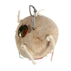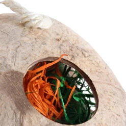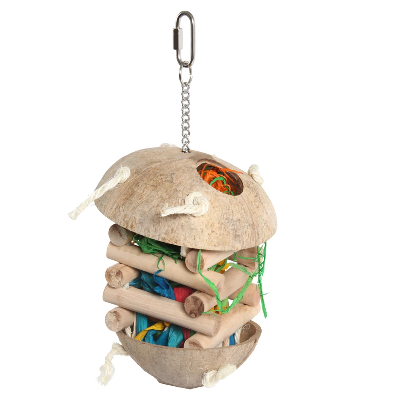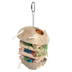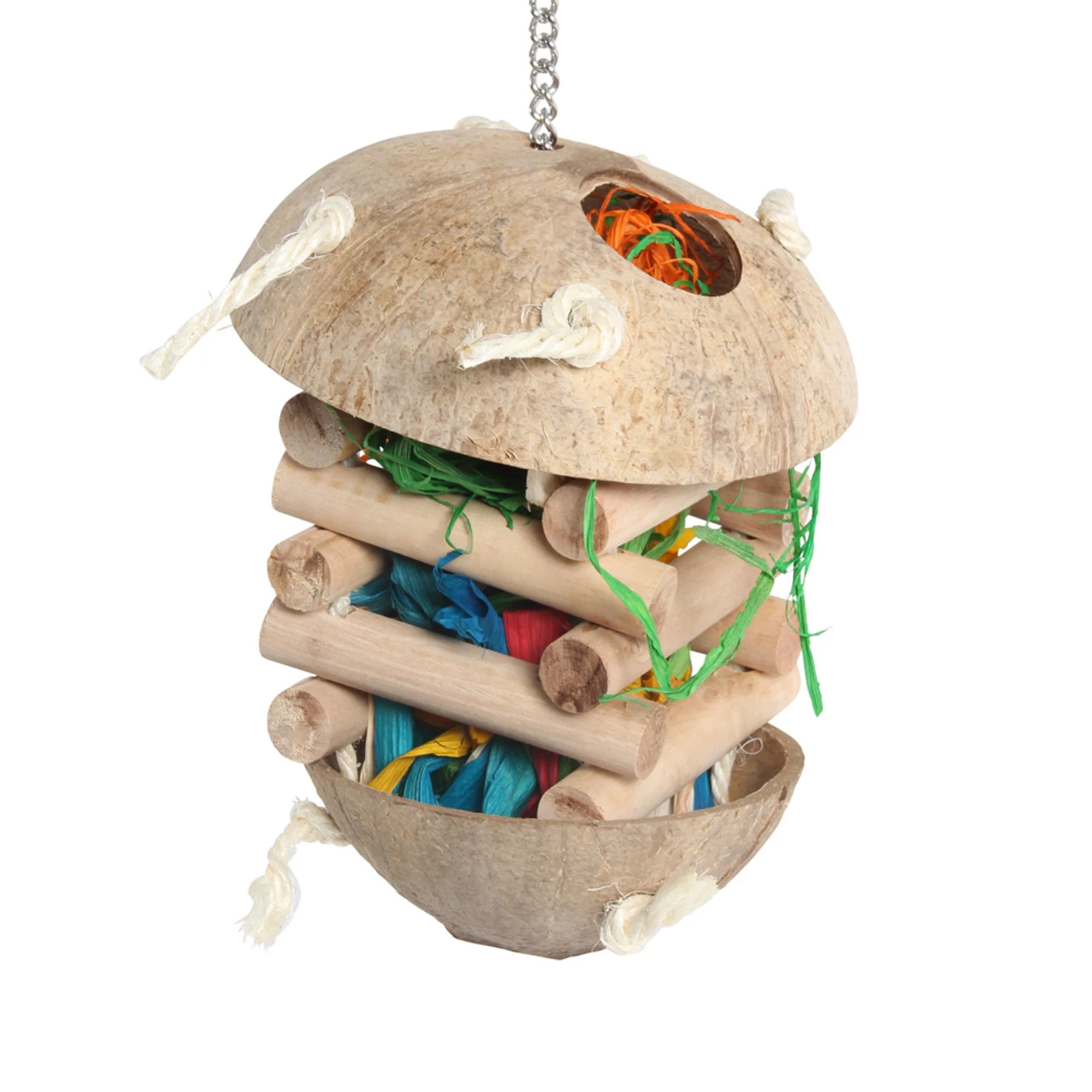 Contained inside the natural wood dowels and coconut shells is colourful seagrass and corn cob pieces. Regardless of how your beaky buddy works on retrieving them, it will be loads of fun.