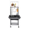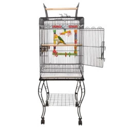 The cage has a drop down front door for easy access, stainless steel feeders, wood perches, and a slide out tray and there is also a storage shelf underneath so you can keep all essentials close by.