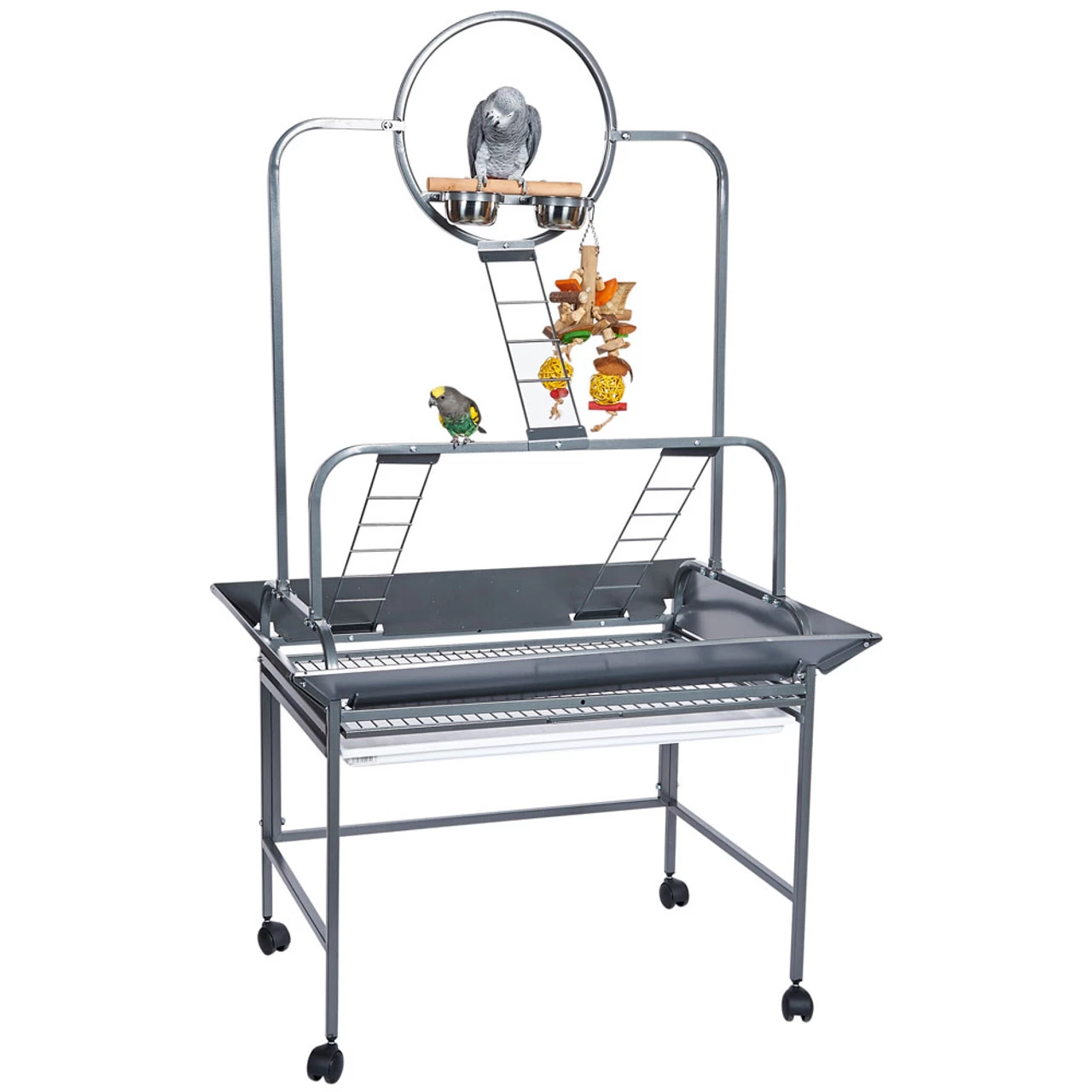 The metal seed catchers, tray and grille are designed to catch any mess your bird makes and keeps it at the bottom out of reach. There are two metal feeding bowls which you can use to provide food and fresh water with or alternatively, fill them with lots of chewable goodies and foot toys.