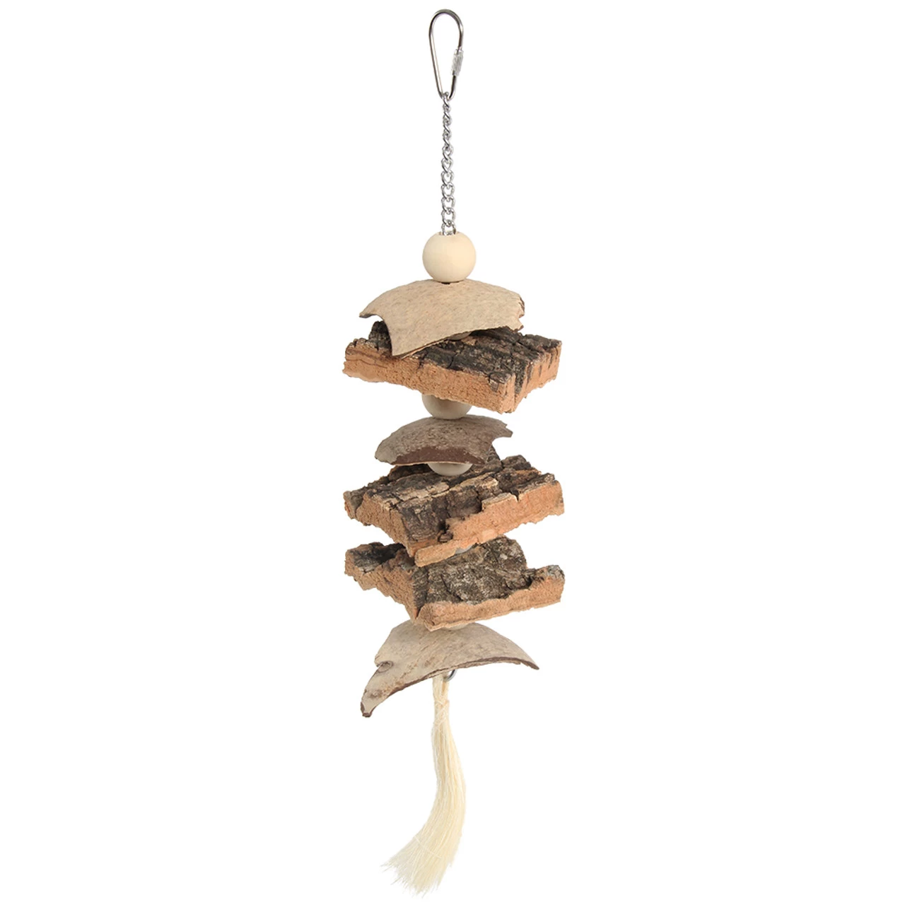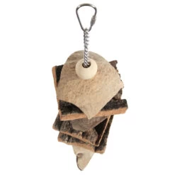 All fastened to a metal chain for added durability, your feathered friend can spend their time chewing on the tuff coconut shell, wood beads and stripping the cork bark slices.