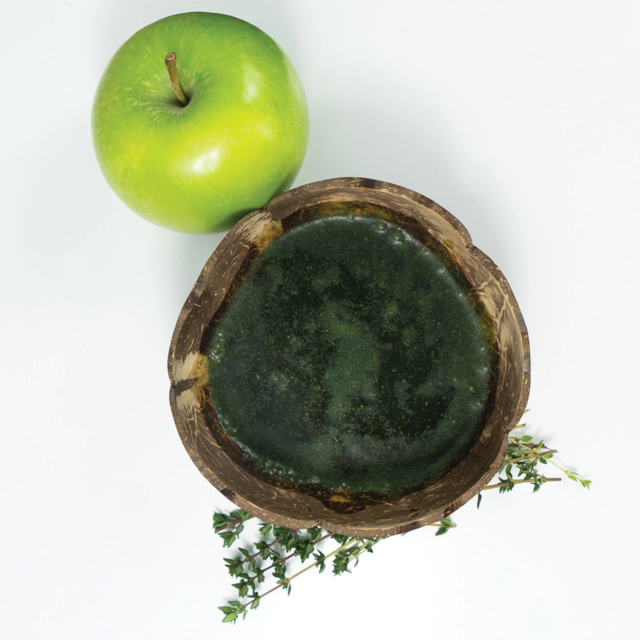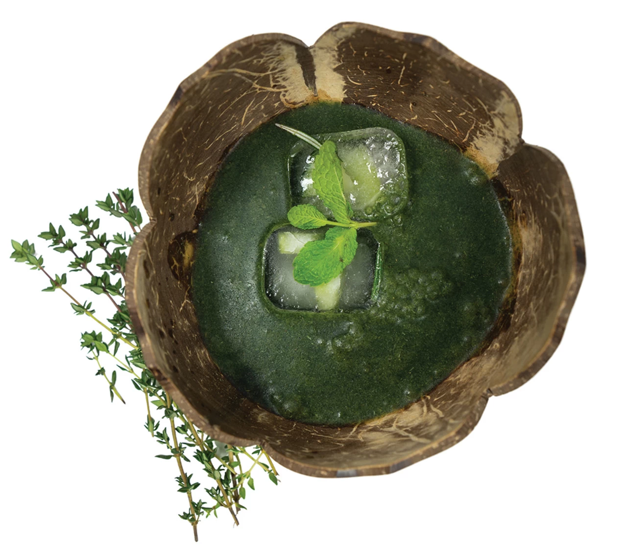 There’s wheatgrass and kale for Vitamins A, C and K, apple for a healthy immune system, banana for potassium, thyme that is known to have anti-inflammatory properties and spirulina for protein.