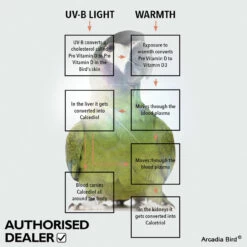 Unlike ineffective LED systems the Arcadia ‘Bird Lamp’ boasts a gentle 2.4% UVB which will, if used as directed, help to both activate natural colour vision and cause the production of the essential Vitamin D3 within the body in a safe and regulated way.