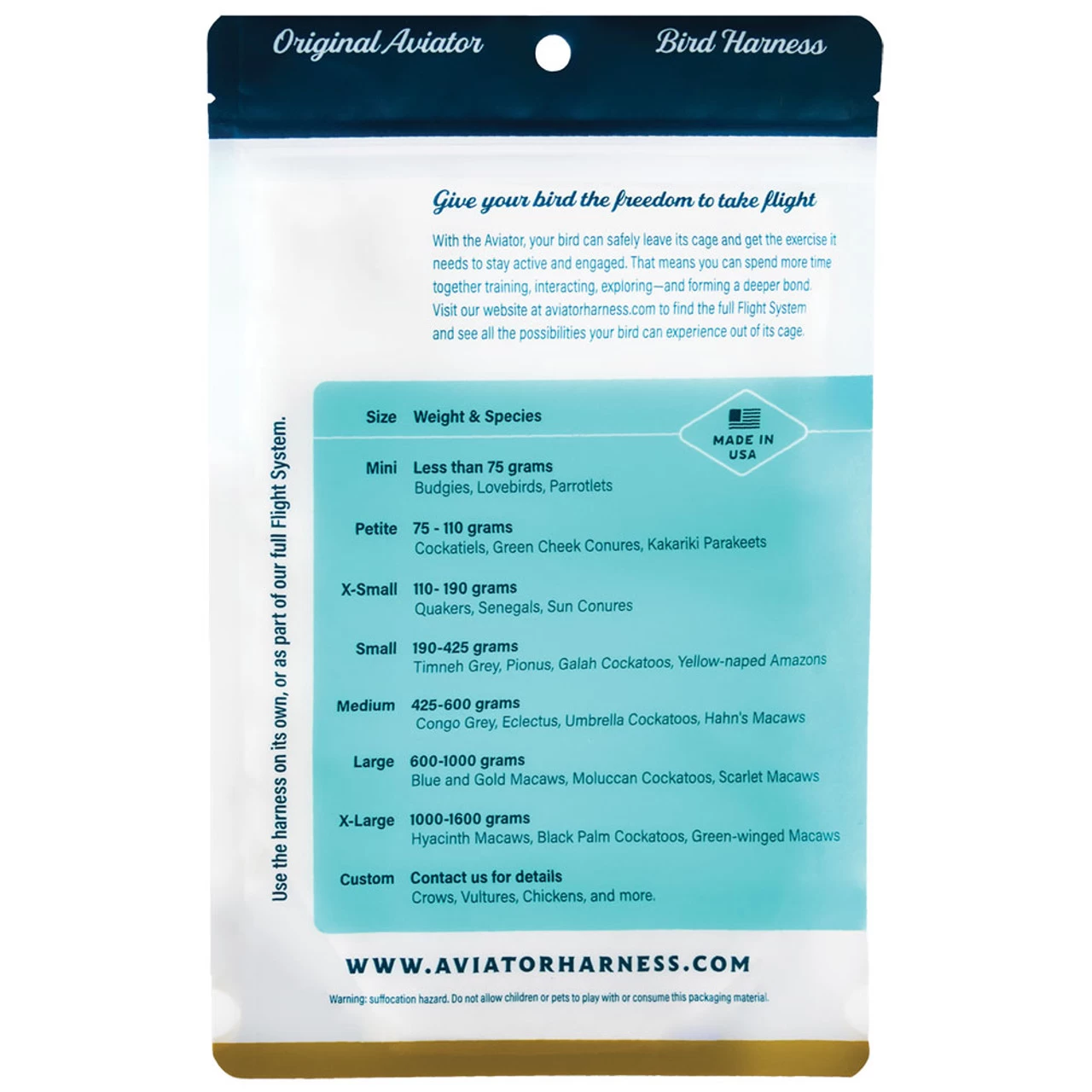 The Aviator Harness is safe and lightweight to allow flight. The lead is elasticated to prevent injury if your bird flies to the end of the lead.
