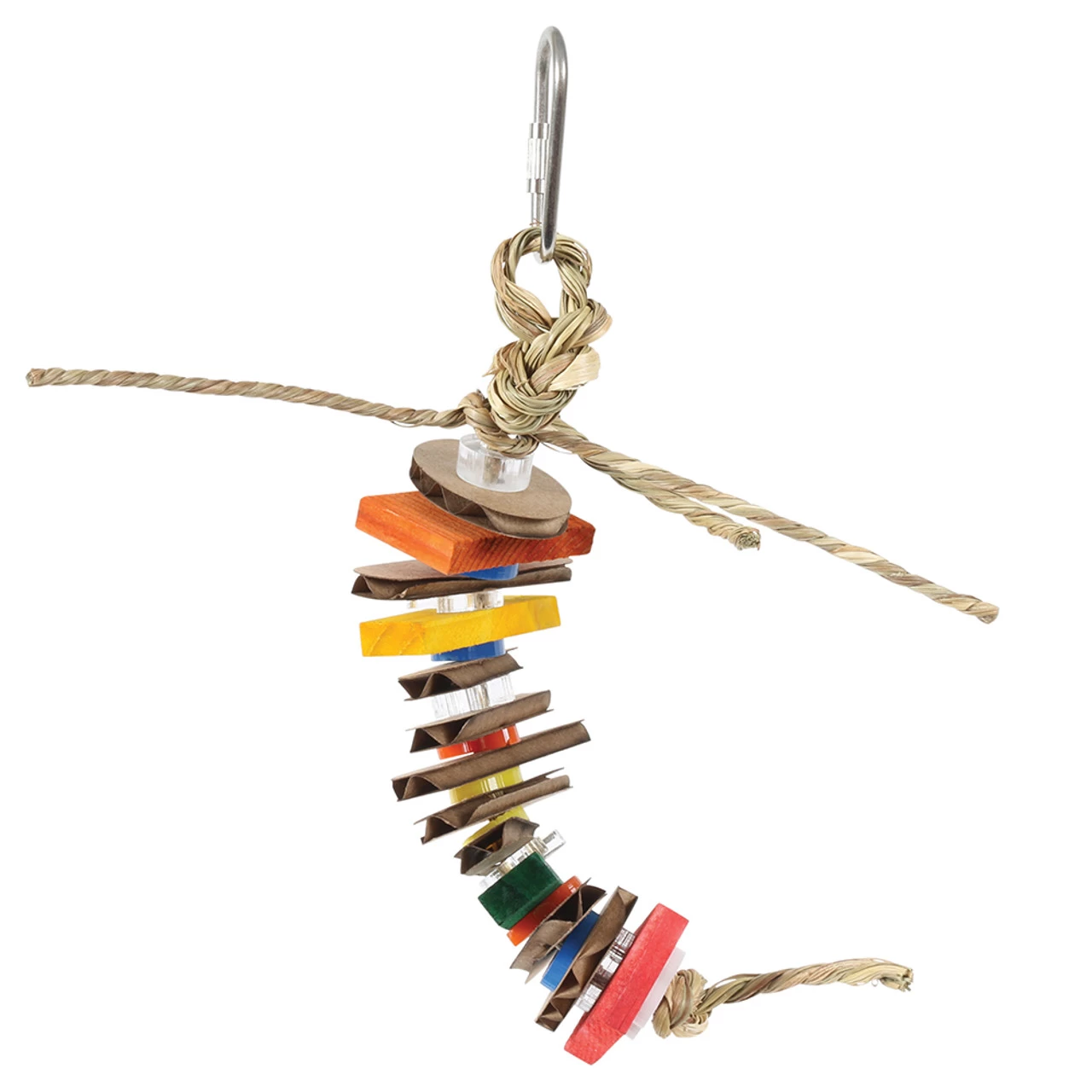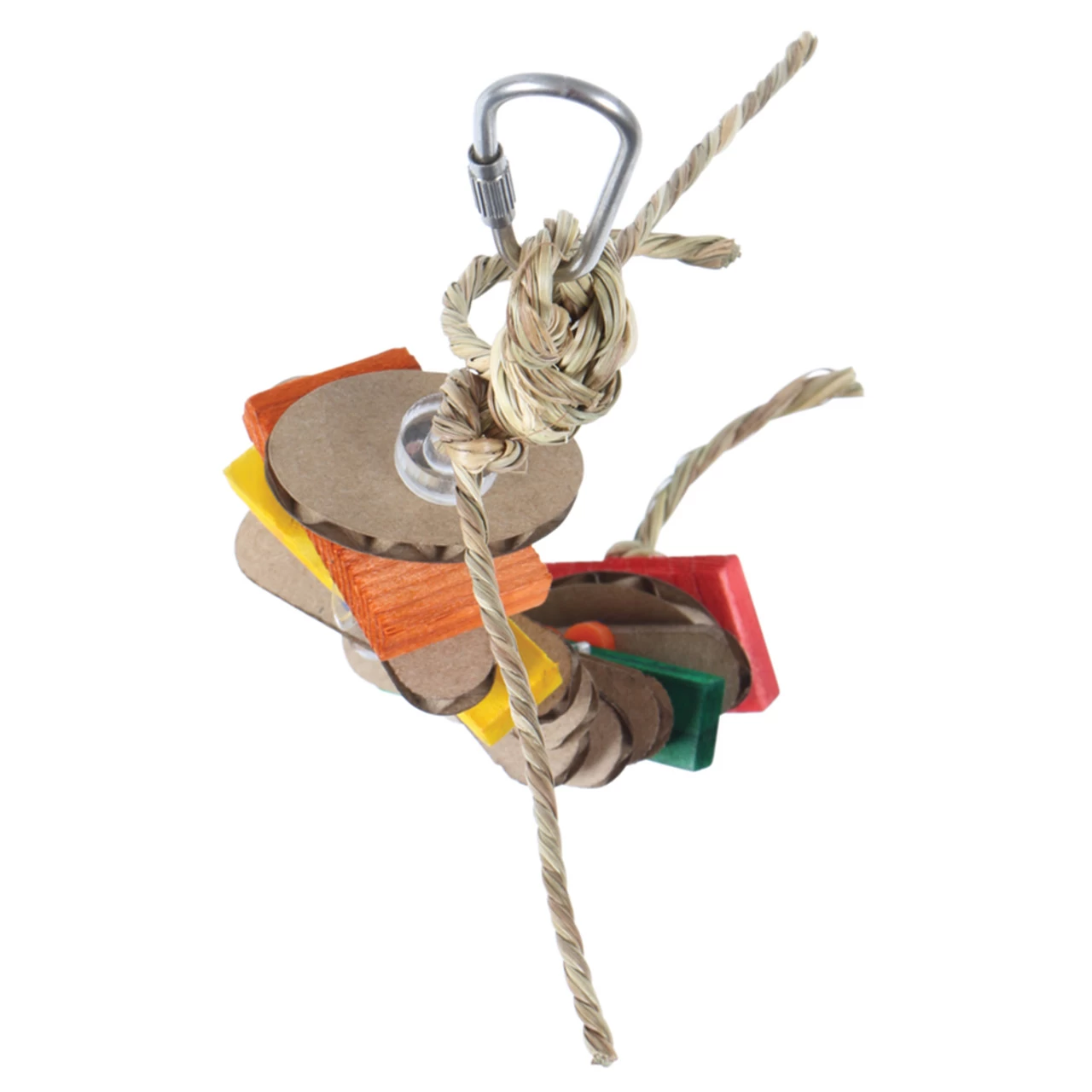 Fastened to a natural seagrass rope your beaky buddy has colourful wood, cardboard slices and acrylic shapes to play with.