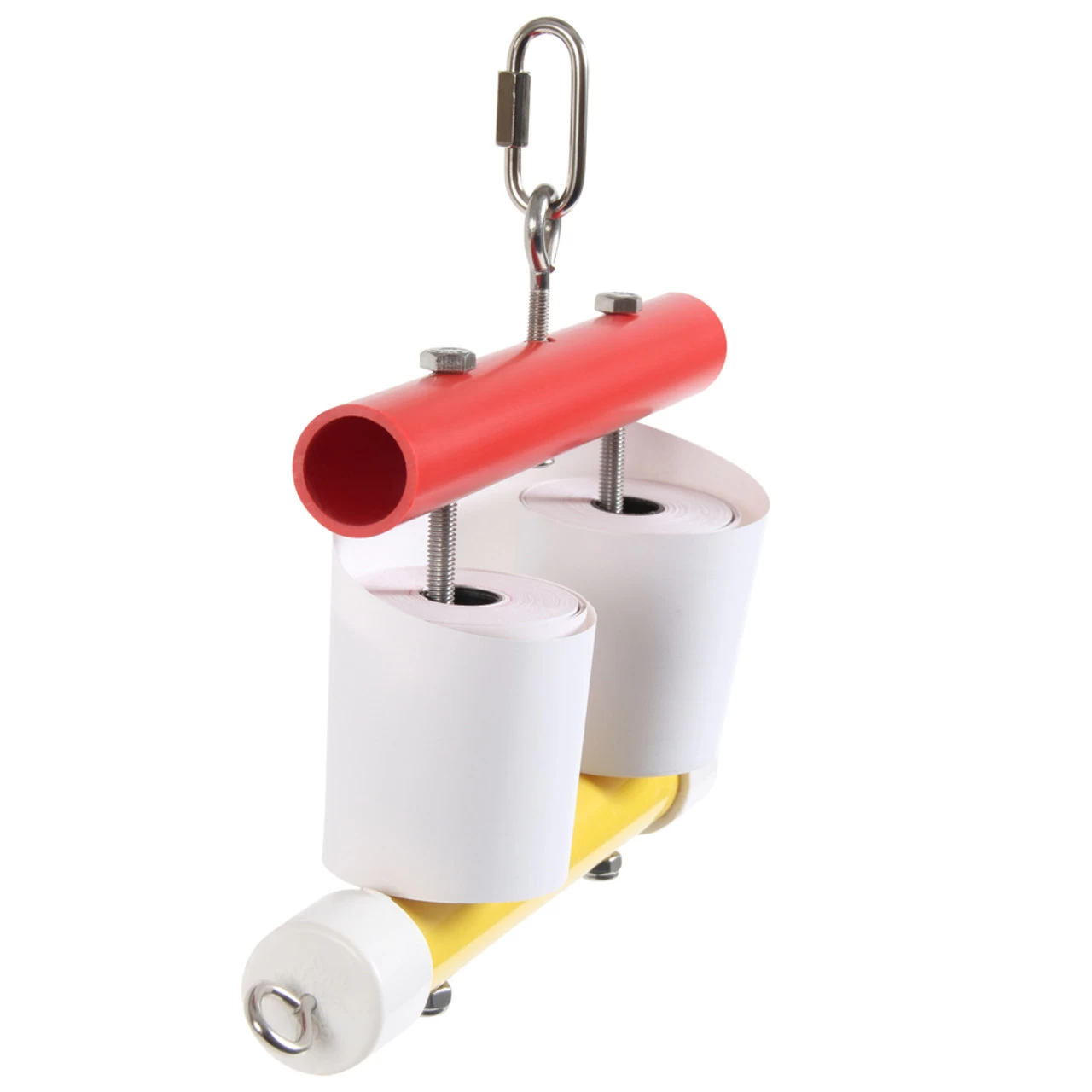 Use the metal quick link provided to quickly and securely fasten this Twin Paper Roll Spooler to your Parrot’s cage or play gym stand.
