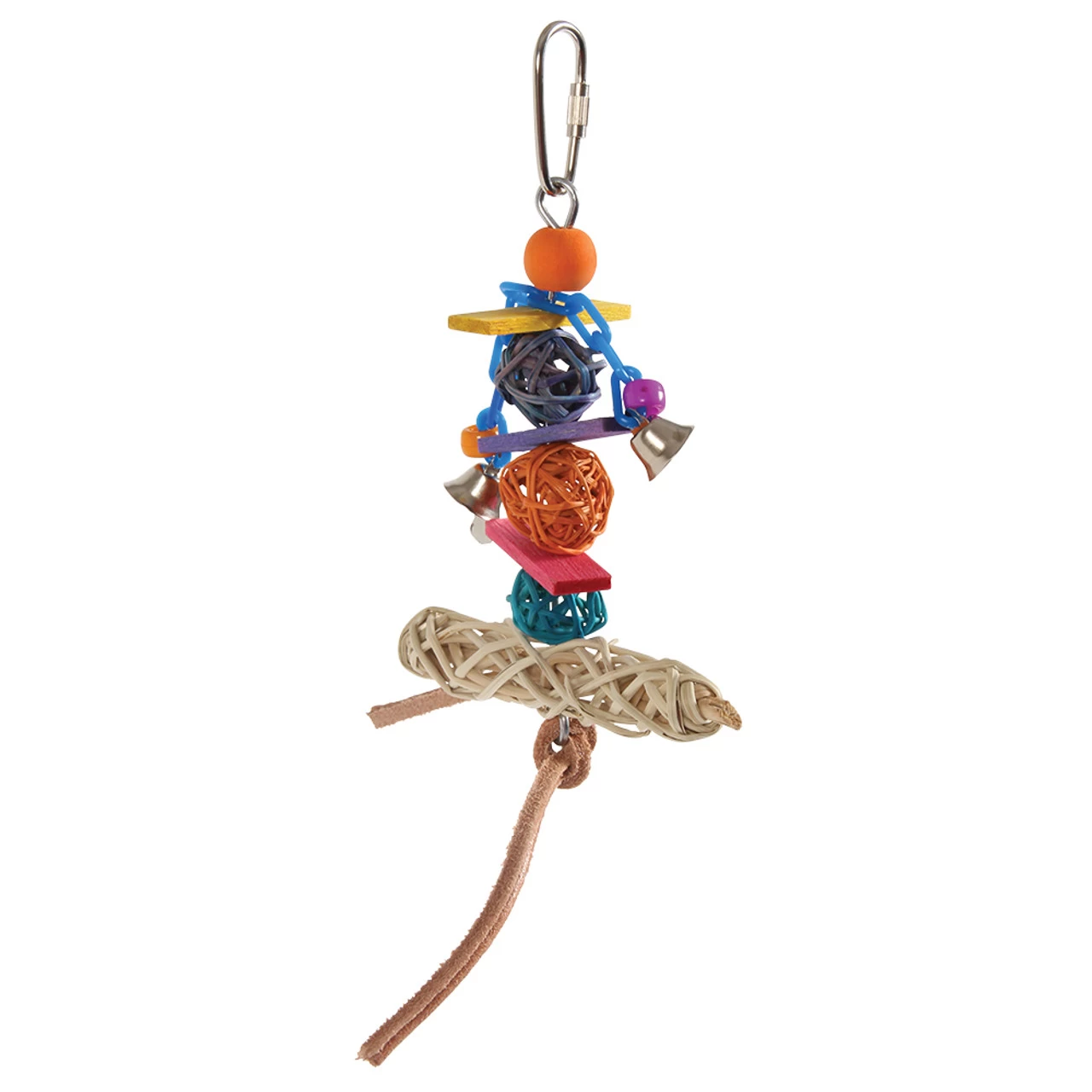 Small species will enjoy a fun bird work out through play, as they balance on the T-Bar to access the soft wood slats, vine balls, plastic chain and mini bells, or the leather strip knotted to the bottom.