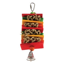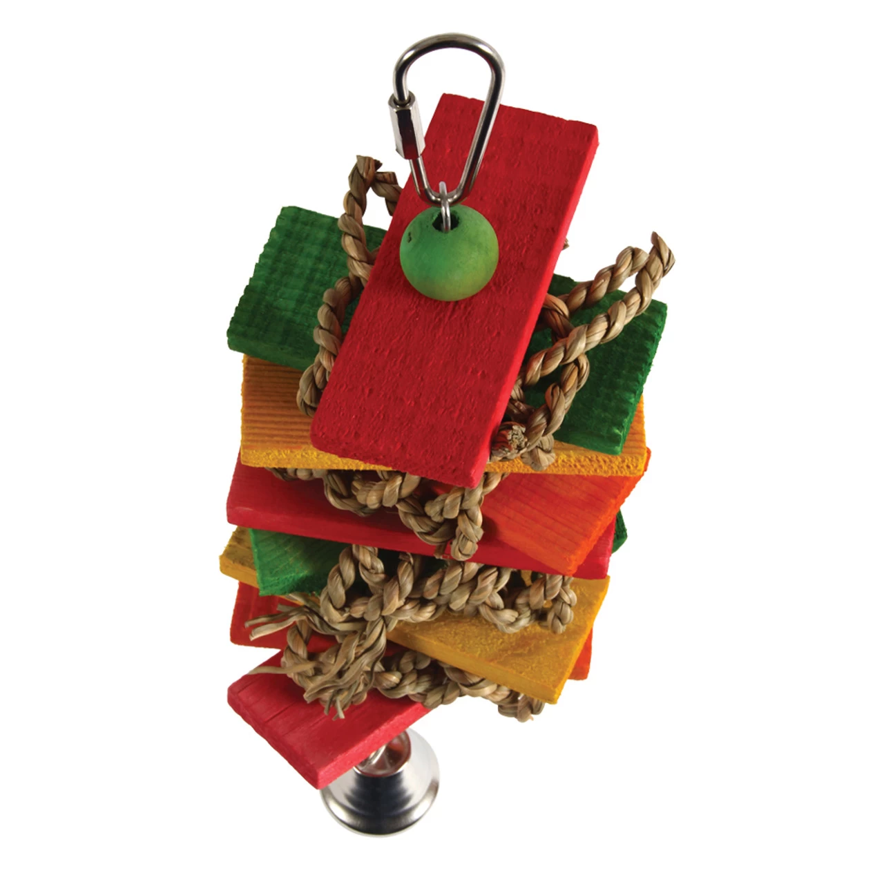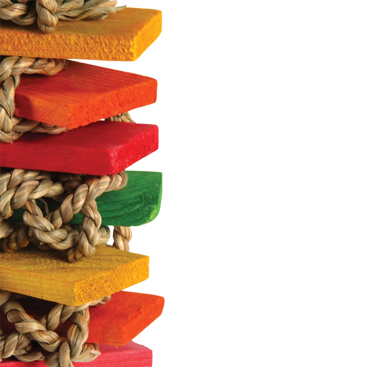 Then sit back and watch them spend their time figuring out the best way to enjoy it. Chewing on the coloured wood slats helps to keep their beak healthy and trim. Unravelling the seagrass and manipulating the toy helps to keep their clever mind busy.